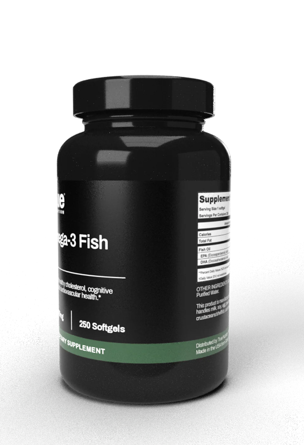 True Nutrition's Omega-3 Fish Oil softgels are strictly sourced from small top-dwelling fish harvested in the wild in order to prevent the accumulation of heavy metals over time.✝ These materials are third-party tested upon receipt to ensure the complete health and safety of our users.✝ As a dietary supplement, Omega-3 Fish Oil may help to support a healthy metabolism, cognitive health, joint health, cardiovascular health, and healthy cholesterol levels.✝ Each standard serving of Omega-3 Fish Oil provides 180mg of EPA and 120mg of DHA in a 1000mg softgel of fish oil.✝✝