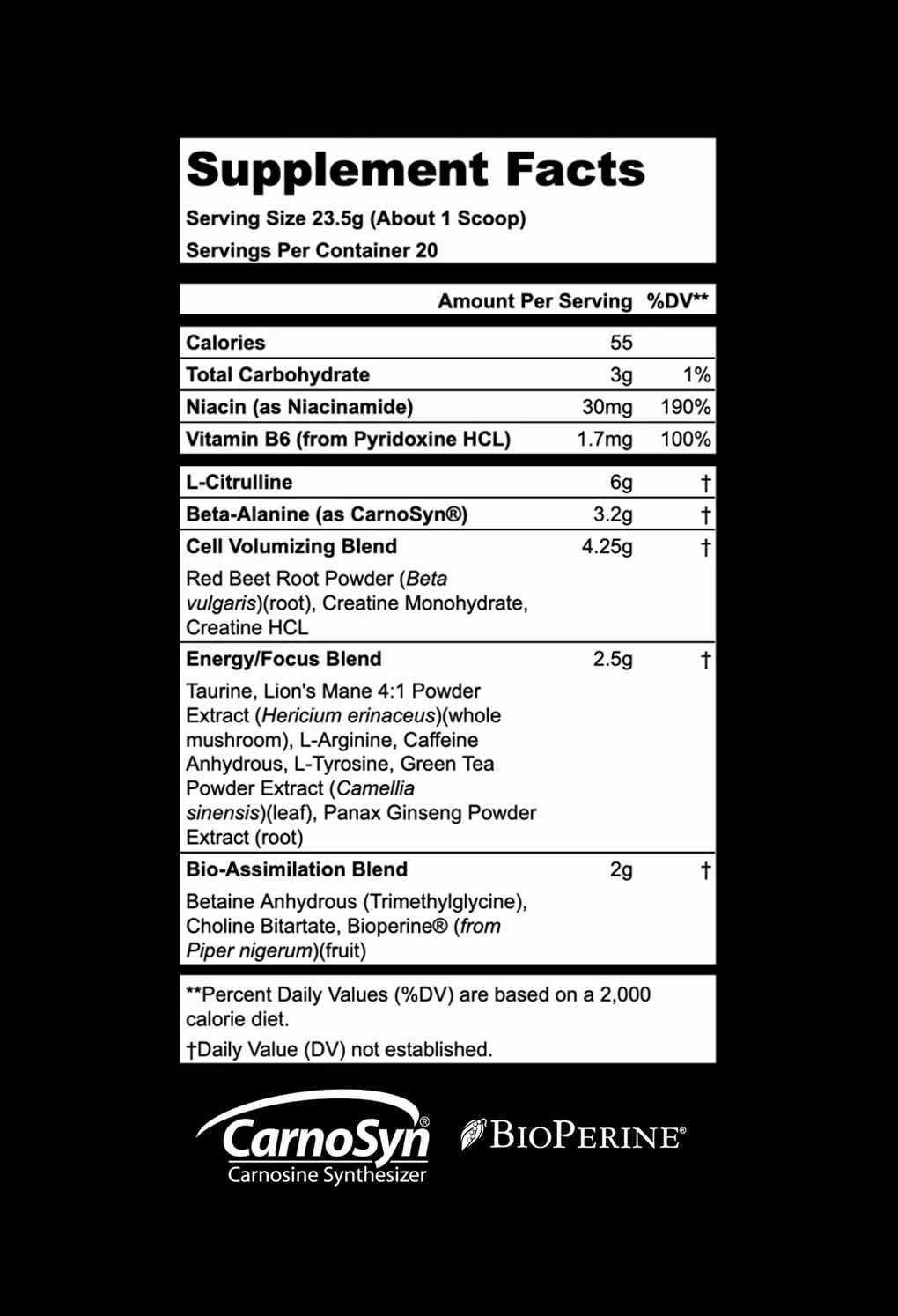 True Nutrition's revolutionary new Pre-Workout utilizes only the latest and most cutting-edge ingredients in dietary supplementation to help athletes reach the next level in their sports nutrition!✝ Pre-Workout offers a synergistic blend of L-Citrulline, Beta-Alanine, Creatine, Beet Root Powder, and many other key ingredients to help support increased energy, endurance, muscle metabolism, and circulatory health.✝ Additionally, the formula is fueled by the patented Bioperine® delivery system to help support absorption rate.✝